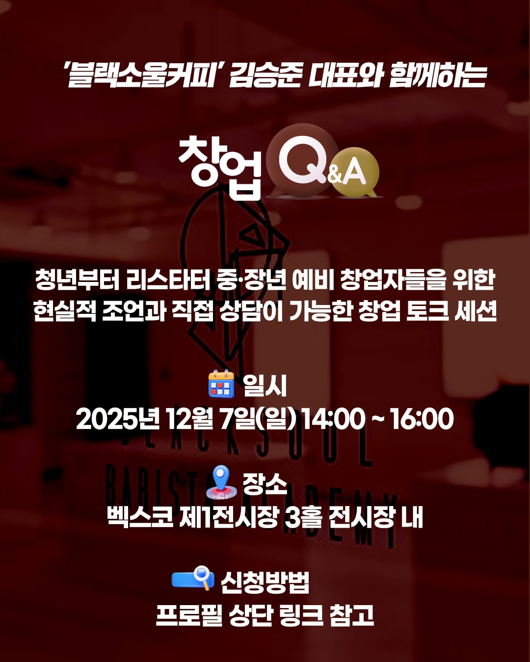 청년과 리스타터, 중·장년 예비 카페 창업자들을 위한 현실적인 조언과 상담이 진행됩니다.